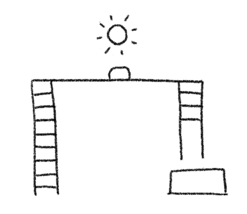 Die Fliege klettert auf die Leiter links, läuft die Planke entlang, sieht das elektrische Licht und das Stück Käse, denkt „Aha, das ist eine Falle!“ und geht weiter. Sie klettert dann die Leiter rechts hinunter, aber: Oh nein! Die unteren Sprossen fehlen, und sie stürzt auf den Marmorblock und bricht sich das Genick. [ACG, 25. Dezember 1910]