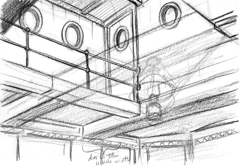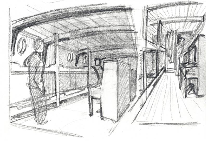 I know there were three sets of double bunks, and my best guess was that they were all along the hull wall. Again based on some roughly similar spaces on the Discovery, and descriptions in journals, this is how I figured it may have looked:
