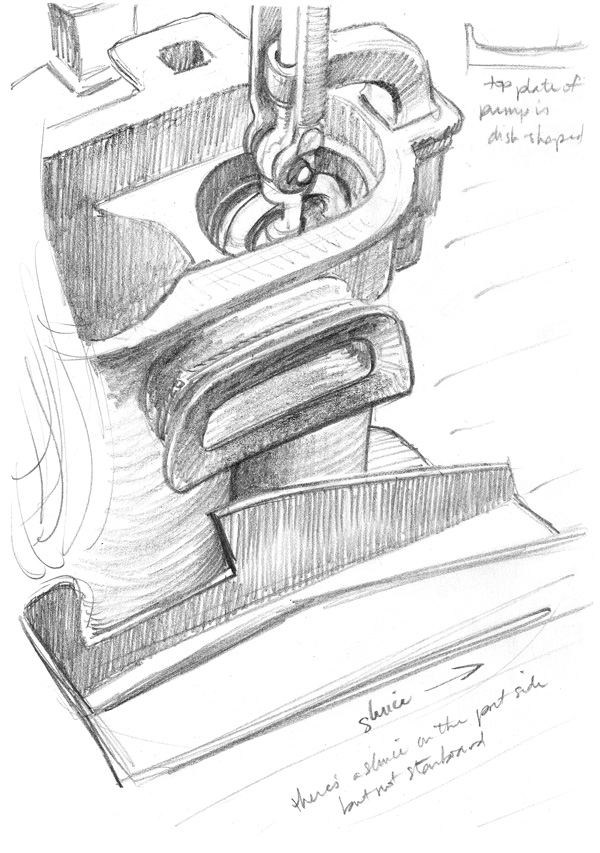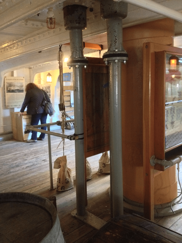 The Star of India’s pump pipes are exposed, rather than encased in a shaft, but you can imagine what a cramped job it was if you picture these encased in a wooden cylinder than only just fits.
