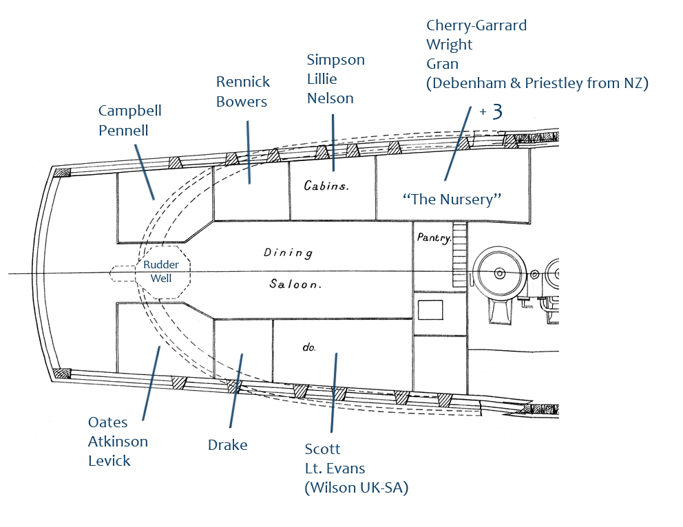 The officers’ cabins opened off the wardroom. These were nearly all shared with at least one other person; even Capt. Scott didn’t get his own personal space. Cherry lists the cabins’ occupants thus: