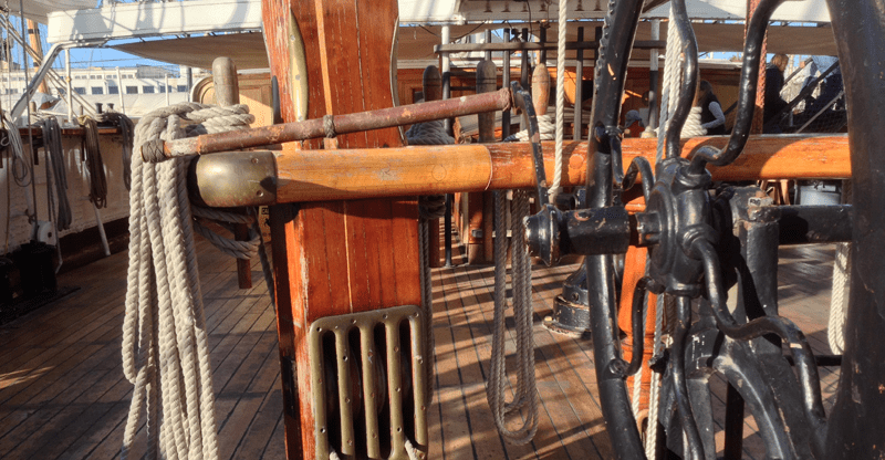 Wardroom: The officers’ mess, where they ate and worked. This was actually on the deck below what you see here: immediately in from the door was a steep stairway down. On the opposite side of the mizzen mast from us was the chart room, an enclosed version of the structure you see in the middle of the bridge. Pennell would do his navigation calculations in there, and if the man at the wheel wasn’t concentrating he’d dash out within a minute to demand why they were off course.