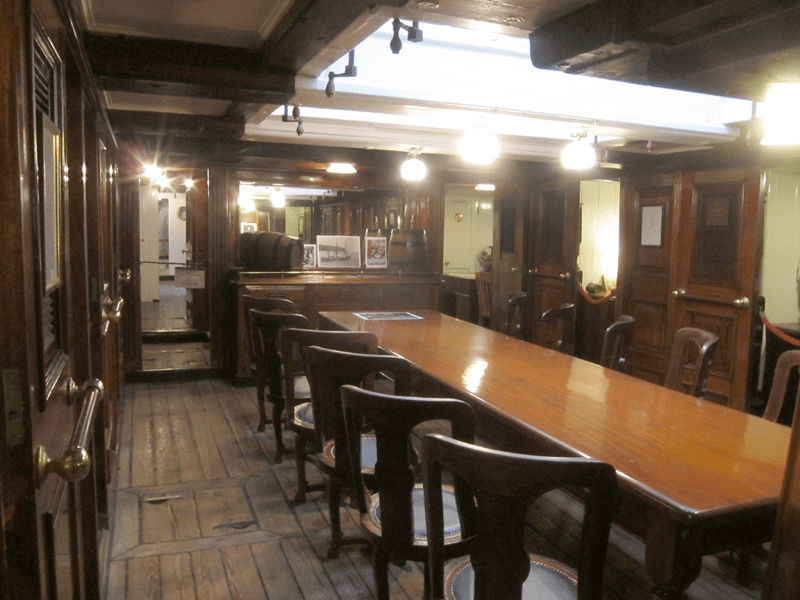 The ship is divided in two: the seamen (or ‘men’) live forward, and the officers aft. On the Terra Nova the officers are collectively known as The Afterguard for this reason. Their headquarters was the wardroom, a large common area under the poop deck at the stern, from which they accessed their cabins. There are only three extant photos of the Terra Nova below decks, and all three are of exactly the same angle in the wardroom. This is the corresponding view in the wardroom of the Discovery: