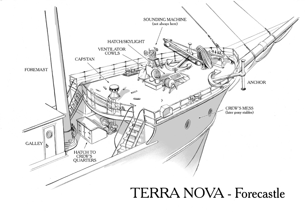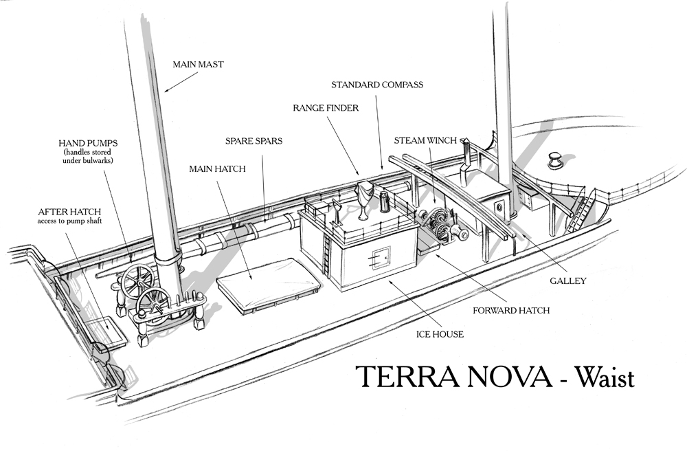 Main Hatch: The largest access point to the hold, where cargo and coal were stored. Birdie Bowers fell through this, nineteen feet to the bottom of the hold, while the ship was being refitted in London, and brushed it off. On their way to Antarctica, two of the three motor sledges, in their great wooden crates, were stowed either side of the main hatch.
