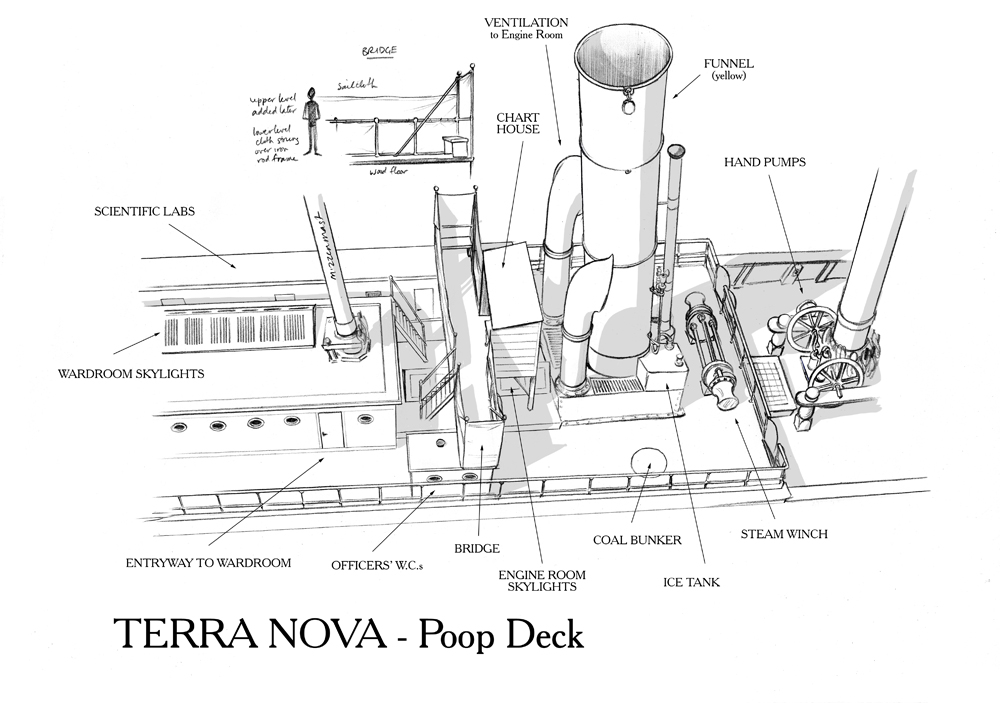 The Terra Nova‘s wardroom skylight had been raised and a deckhouse built around it, giving the wardroom a sort of second storey. Along the starboard side of this ran a balcony, with a door to the quarterdeck, and another at the forward end of the deckhouse, on the starboard side. This balcony was handy as a sort of mudroom for those coming in with wet oilskins and icy clothing, to change before heading into the dry comfort of the wardroom and cabins.