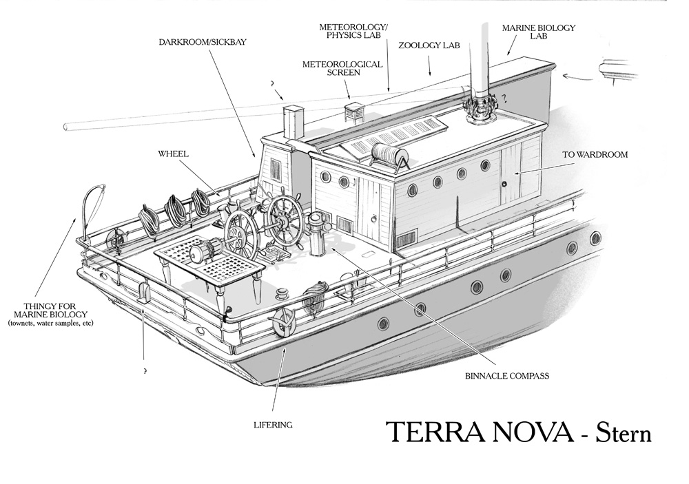 Everything on this page originated in posts on my Patreon, which I shared with my supporters throughout the research phase. The detail is more exhaustive over there, so if you’re still curious, sign up and dig into the Terra Nova tag. You can also tumble a 3D model of the ship, thanks to Daniela Schaffenberg and her ability to translate Edwardian diagrams and my sketches into geometry.